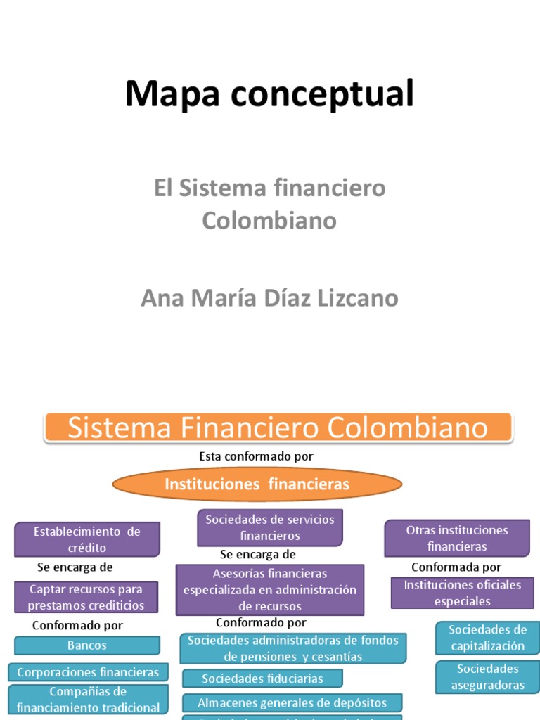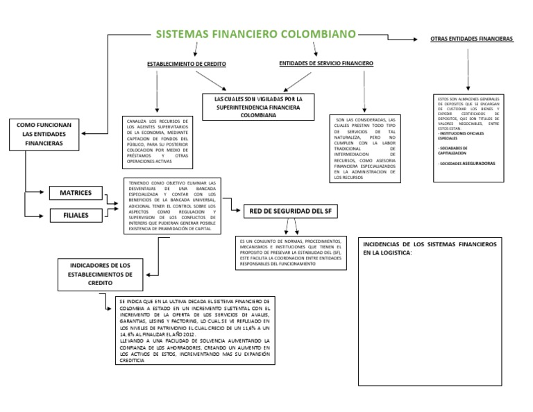 Mapa conceptual sistema financiero de colombia. Este documento tiene como finalidad definir mediante un mapa conceptual los conocimientos adquiridos sobre el sistema financiero en Colombia y su aplicación en este proyecto de gestión logística. Mapa conceptual el sistema financiero colombiano fase de analisis. El sistema financiero colombiano ha exhibido una expansión en la última década sustentada tanto en la creciente intermediación tradicional realizada por los EC como en la oferta de otros servicios financieros e.
