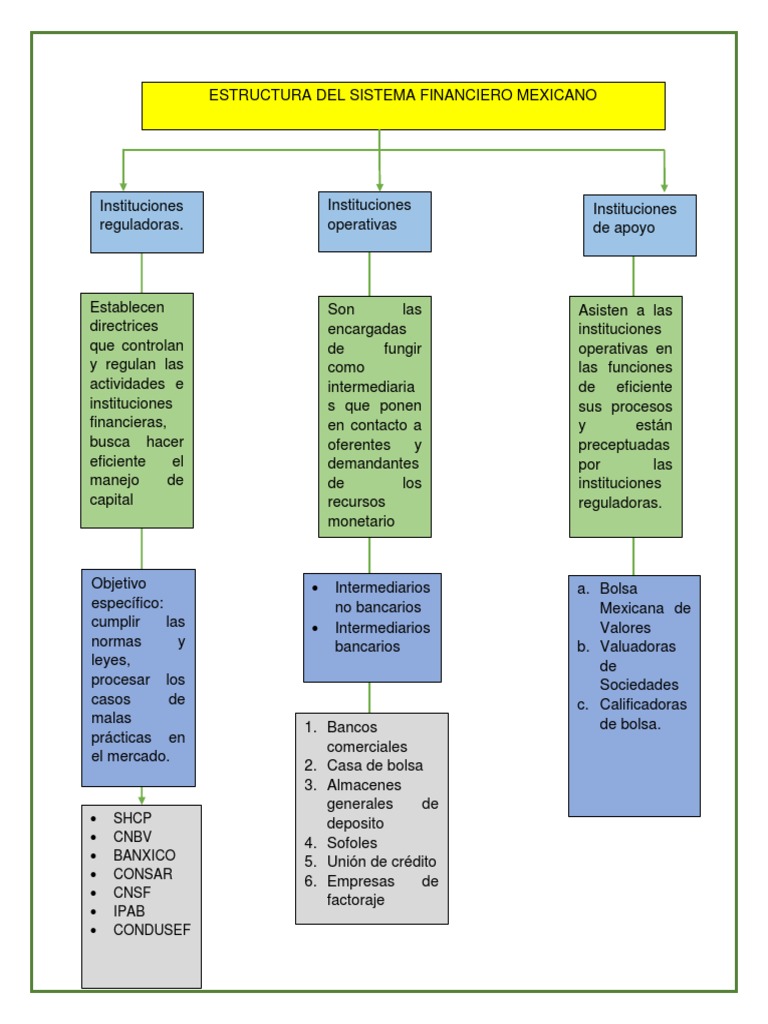 La estructura del Sistema Financiero Mexicano se divide en 3 categorías. Éstos a su vez se especializan en ciertos productos y servicios y que son regulados por un marco normativo y. SISTEMA FINANCIERO MEXICANO El Sistema Financiero Mexicano puede definirse como el conjunto de organismos e instituciones que captan administran y canalizan a la inversión el ahorro dentro del marco legal que corresponde en territorio nacional.